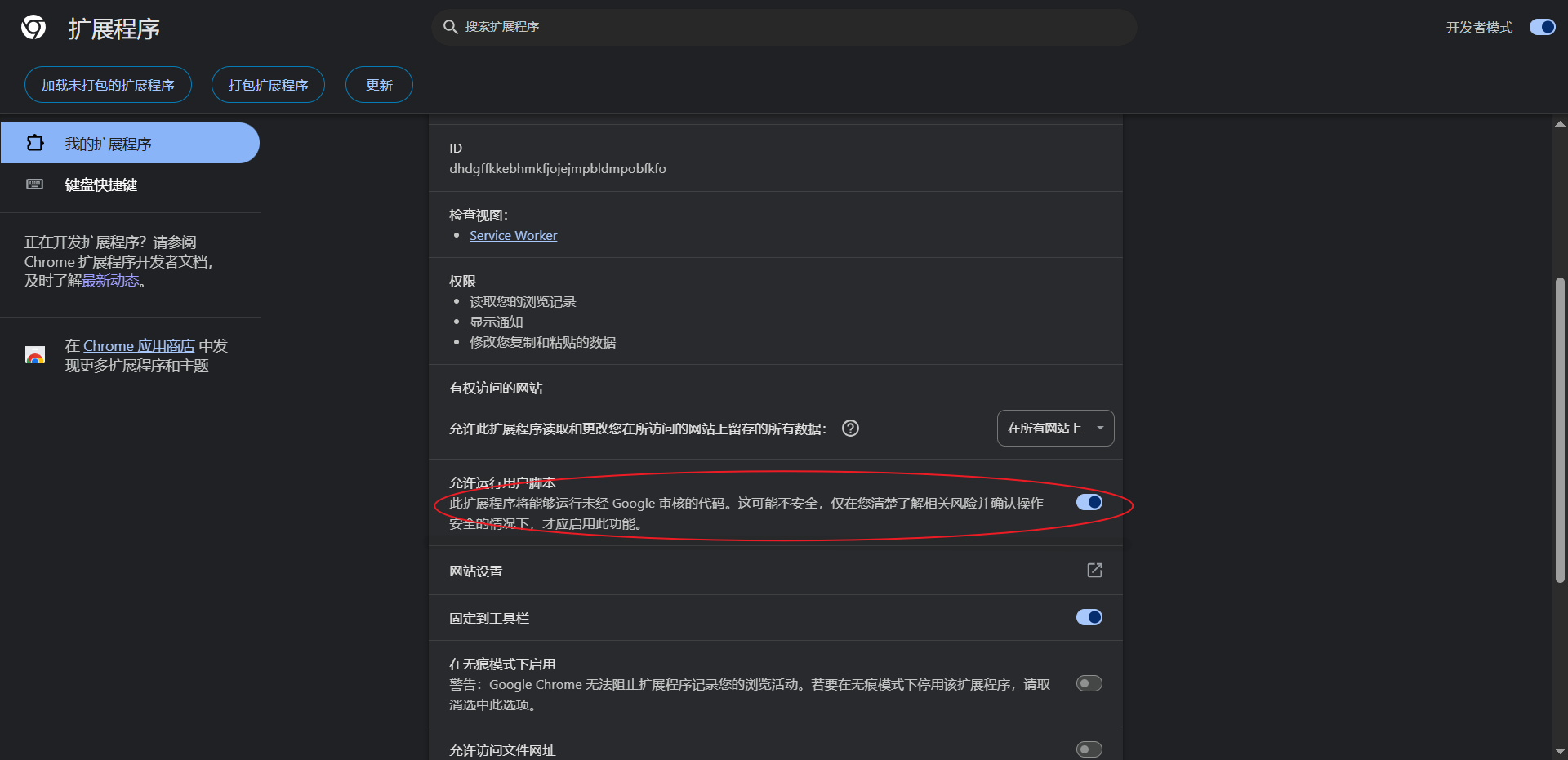 - 打开扩展中的开发人员选项,并允许篡改猴执行用户脚本。